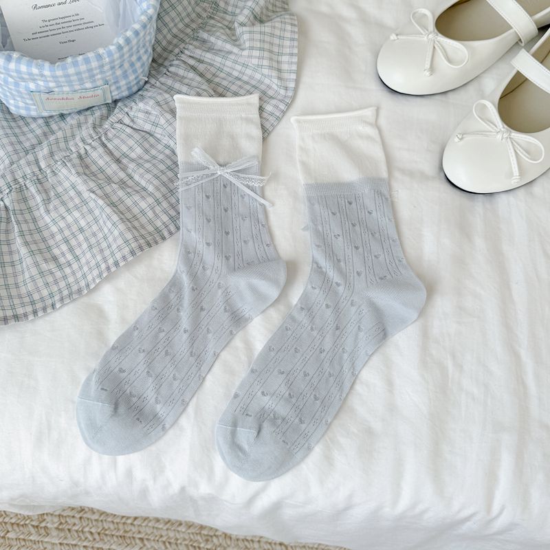 Tất Vớ nữ, màu xanh nhạt, thêu nơ hình gấu thủ công, chất liệu lưới thoáng khí, kiểu vớ rộng đa năng. Trái tim xanh
