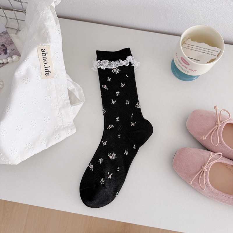 Tất Vớ dài đến bắp chân viền ren mùa xuân/hè dành cho nữ, kiểu dáng học sinh Nhật Bản, ngọt ngào, không đường may, vớ lưới hoa nhỏ Một cỡ duy nhất, màu đen