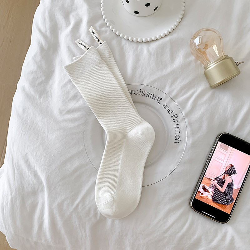 Tất Vớ nữ kiểu Hàn Quốc mùa thu 2025 mới, kẻ sọc dọc, dài đến bắp chân, có nhãn chữ ở gót, màu trơn, kiểu vớ rộng rãi đa năng, màu trắng, một cỡ phù hợp với tất cả mọi người.