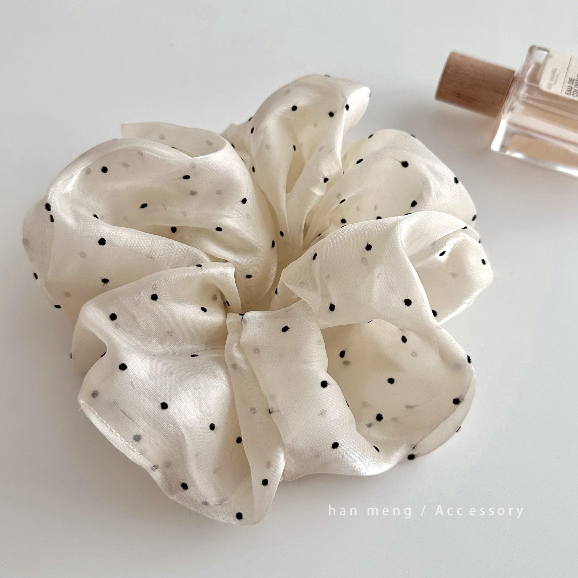 Scrunchies satin chấm bi trắng