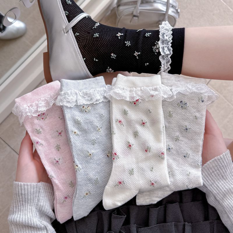 Tất Vớ dài đến bắp chân viền ren mùa xuân/hè dành cho nữ, kiểu dáng học sinh Nhật Bản, ngọt ngào, không đường may, vớ lưới hoa nhỏ Một cỡ duy nhất, màu đen