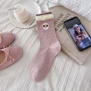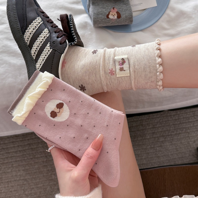 Tất Vớ nữ kiểu Hàn Quốc màu hồng thêu họa tiết hình chú cún hoạt hình, kiểu dáng năng động, vớ dài đến bắp chân phối màu, chất liệu cotton. Màu hồng, một cỡ phù hợp với tất cả.